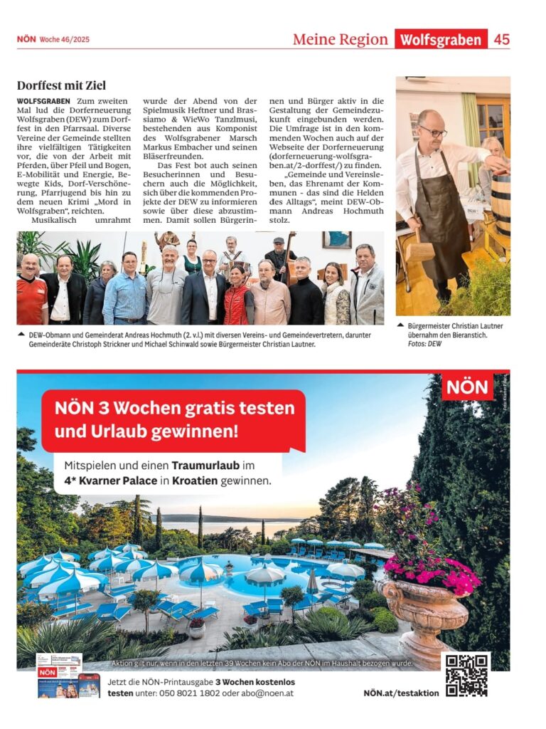 Am 7. November fand im Pfarrsaal das zweite Dorffest der Dorferneuerung Wolfsgraben (DEW) statt – ein Abend voller Musik, Begegnung und Ideen für die Zukunft unseres Ortes.